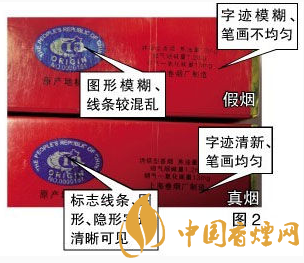 真品“中華”印刷套色準(zhǔn)確,字跡清新、筆畫均勻,字樣邊緣呈細(xì)微的齒輪狀,而不是人們普遍認(rèn)為的平滑狀。假煙字跡模糊、筆畫不均勻,字樣邊緣呈平滑狀。真品“中華”原產(chǎn)地標(biāo)志采用中國(guó)地圖圖案,細(xì)看海南島和臺(tái)灣島為空心,在某些角度和光線下圖案背景會(huì)呈現(xiàn)“中華”字樣,標(biāo)志線條、圖形、隱形字跡清晰可見。假煙原產(chǎn)地標(biāo)志圖形模糊、線條較混亂。