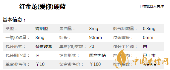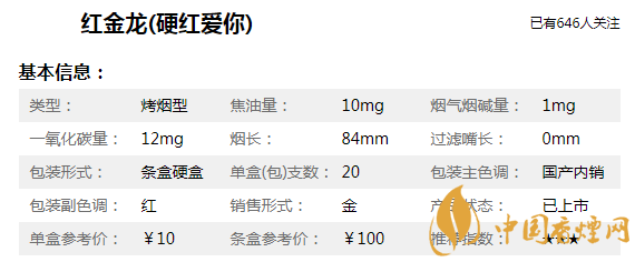 紅金龍(愛你)硬藍煙身長90mm,焦油含量僅為8mg/支,煙支修長雅致、煙氣淡雅醇厚、口感醇和細膩。帶給品吸者新鮮有趣的吸食體驗和適中的滿足感。吸食口感上,和南京炫赫門比較相似,低焦、低危害對身體危害也要低一些。只不過目前部分地區(qū)已經買不到該款煙了,消費者要注意甄別真假,以免上當受騙。