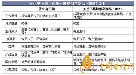 新型煙草是一種具備減害效果的尼古丁傳遞系統(tǒng),其煙氣中的有害物質(zhì),如焦油、一氧化碳等,含量遠(yuǎn)低于傳統(tǒng)卷煙。新型煙草可分為霧化電子煙、加熱不燃燒煙草制品(HeatNotBurning,HNB)兩大類,其中霧化電子煙又包括封閉式(霧化室為封閉系統(tǒng),換彈式)和開(kāi)放式(霧化室為開(kāi)放系統(tǒng),注油式)兩種。霧化電子煙和HNB的差異性主要體現(xiàn)在工作原理、煙彈成分、產(chǎn)品定位等方面。