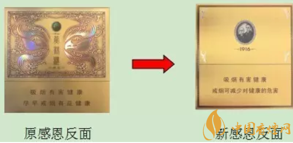 設(shè)計(jì)改版:黃鶴樓1916感恩香煙整體顏色改為鎏金色彩,反面圖案進(jìn)行了簡(jiǎn)化,畫面僅有南洋兄弟頭像和“1916”標(biāo)識(shí),盒型由原來的橫推升級(jí)為全開。