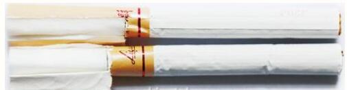 7、真品卷煙的涂膠位置與商標(biāo)紙邊緣有預(yù)留距離,假冒卷煙的涂膠位置與商標(biāo)紙邊緣一般無(wú)預(yù)留距離。