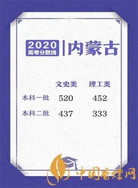 本科一批:理工類為452分,文史類為520分;本科二批:理工類為333分,文史類為437分。