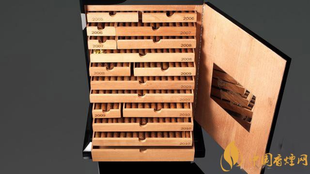 雪茄柜是一個木制烤漆立柜,方方正正的。主體是黑色,雪茄盒上裝飾著一張世界地圖,雪茄系列所代表的任何國家/地區(qū)都會在柜子表面上發(fā)出黑暗的光芒。打開柜子,里面是不同年份的抽屜,抽屜里面裝著這個年份的地區(qū)限量版雪茄。