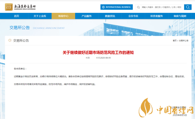 8月5日,上金所發(fā)布公告稱,近期黃金價格創(chuàng)歷史新高,白銀價格持續(xù)高位大幅波動。請各會員單位繼續(xù)提高風(fēng)險防范意識,做細做好風(fēng)險應(yīng)急預(yù)案,提示投資者做好風(fēng)險防范工作,合理控制倉位,理性投資。