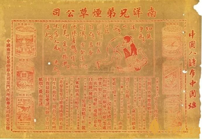 18世紀90年代初,由愛國華僑簡照南、簡玉階兄弟二人創(chuàng)辦的南洋兄弟煙草公司推出一枚“大中華”煙標,抗擊英美“洋煙”;