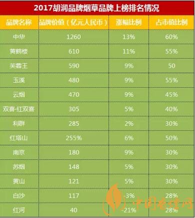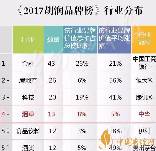 13家煙草企業(yè)登2017胡潤(rùn)品牌排行榜 煙草品牌總價(jià)值4861億(中華第一)