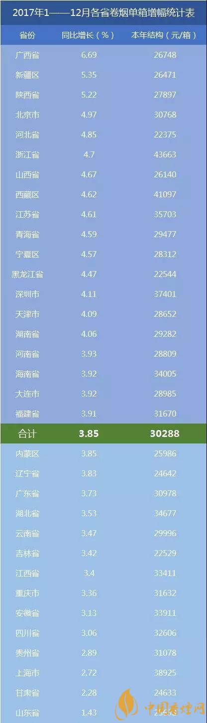 2017全國卷煙銷量增幅情況: