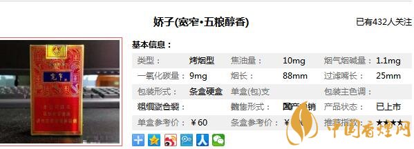 嬌子(寬窄·五糧醇香)香煙由四川中煙出產(chǎn),是嬌子品牌旗下的一款香煙,四川中煙與五糧液集團聯(lián)合發(fā)布了寬窄·五糧濃香,開啟了寬窄·五糧這個品系,寬窄五糧醇香多少一包,這款五糧醇香的價格比起高高在上的五糧濃香要親民很多,指導(dǎo)價為30元/包,下面就來對寬窄五糧醇香香煙價格圖片進行介紹。