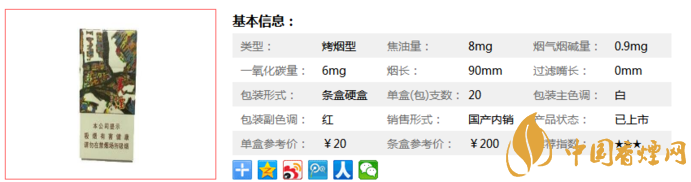 類(lèi)型 :烤煙型 焦油量 :8mg 煙氣煙堿量 :0.9mg 一氧化碳量 :6mg