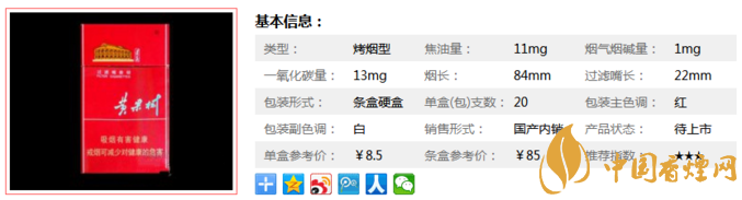 類型 :烤煙型 焦油量 :11mg 煙氣煙堿量 :1mg 一氧化碳量 :13mg