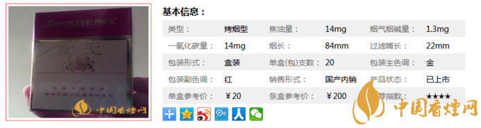 類型 :烤煙型 焦油量 :14mg 煙氣煙堿量 :1.3mg 一氧化碳量 :14mg
