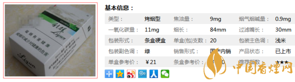 類型 :烤煙型 焦油量 :9mg 煙氣煙堿量 :0.9mg 一氧化碳量 :11mg