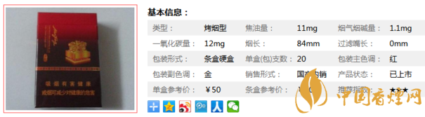 類型 :烤煙型 焦油量 :11mg 煙氣煙堿量 :1.1mg 一氧化碳量 :12mg