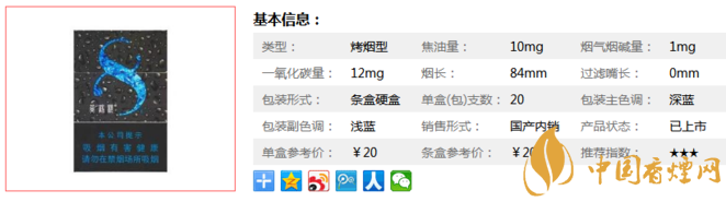 類型 :烤煙型 焦油量 :8mg 煙氣煙堿量 :0.8mg 一氧化碳量 :10mg