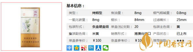 類(lèi)型 :烤煙型 焦油量 :8mg 煙氣煙堿量 :0.8mg 一氧化碳量 :8mg