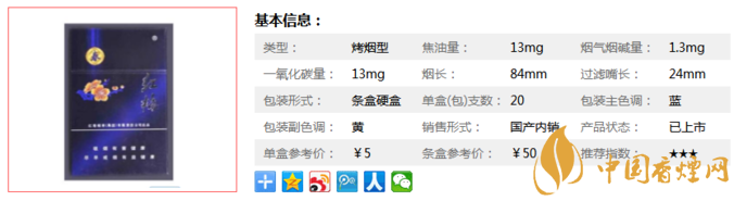 | 類型 :烤煙型 | 焦油量 :13mg | 煙氣煙堿量 :1.1mg | 一氧化碳量 :13mg |