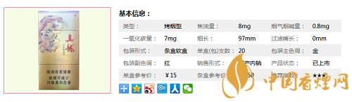 類型 :烤煙型 焦油量 :8mg 煙氣煙堿量 :0.8mg 一氧化碳量 :7mg