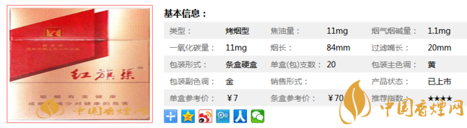 類型 :烤煙型 焦油量 :11mg 煙氣煙堿量 :1mg 一氧化碳量 :11mg