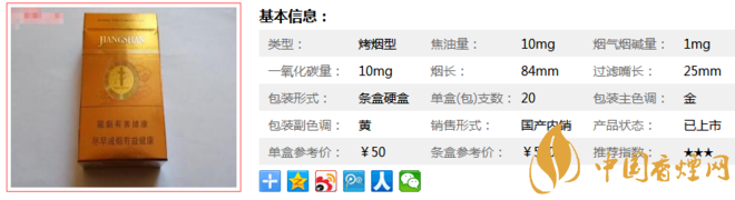 “江山”牌低危害卷煙由于采用不斷完善的中草藥提取液,每支煙中含有0.5%的“仙芪補腎顆粒”新型料液,除了低害特征外,最大的成功是理想地解決了低危害卷煙中的幾個常見問題,如卷煙品質至上、煙藥協調、口感余味、有效成分轉移等。下面我們一起來看江山一統香煙的參數信息:焦油量:10mg 煙堿量:1mg 一氧化碳量:10mg