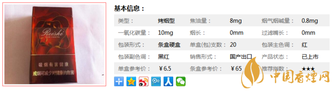 類型 :烤煙型 焦油量 :8mg 煙氣煙堿量 :0.8mg 一氧化碳量 :10mg