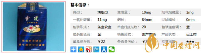 | 類型 :烤煙型 | 焦油量 :10mg | 煙氣煙堿量 :1mg | 一氧化碳量 :11mg |