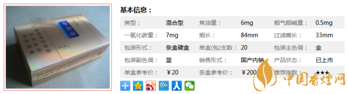 | 類型 :混合型 | 焦油量 :6mg | 煙氣煙堿量 :0.5mg | 一氧化碳量 :7mg |