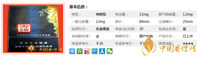 這款煙整體采用藍(lán)色為主調(diào),邊上點綴金色花邊,里面煙支也是藍(lán)色,看上去很有點檔次的。定價有點高,但是盒子真心好看,偶爾買來一包用來收藏還是非常不錯的選擇。經(jīng)香煙網(wǎng)小編市場調(diào)查御貓藍(lán)售價為36元/包。