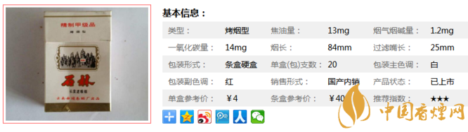 石林硬香煙,煙支長84mm,在開發(fā)過程中,經(jīng)與國外有實力的知名香料公司多次進(jìn)行合作研究,研發(fā)試驗200多次,最賦予該產(chǎn)品獨特的加香加料風(fēng)格。下面我們一起來看石林硬的參數(shù)信息:焦油量:13mg 煙堿量:1.2mg 一氧化碳量:14mg.