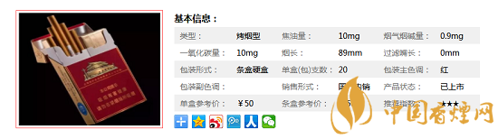 | 煙長(zhǎng):89mm | 過濾嘴長(zhǎng):25mm | 包裝形式:條盒硬盒 | 單盒(包)支數(shù):20 |