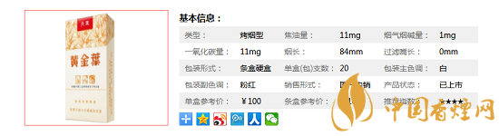 | 類型 :烤煙型 | 焦油量 :11mg | 煙氣煙堿量 :1mg | 一氧化碳量 :11mg |