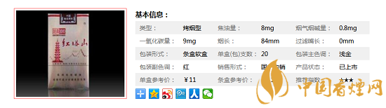 | 類型 :烤煙型 | 焦油量 :8mg | 煙氣煙堿量 :0.8mg | 一氧化碳量 :9mg |