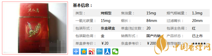 類型 :烤煙型 焦油量 :13mg 煙氣煙堿量 :1.2mg 一氧化碳量 :13mg