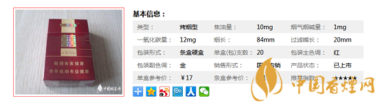 | 類型 :烤煙型 | 焦油量 :10mg | 煙氣煙堿量 :1mg | 一氧化碳量 :12mg |
