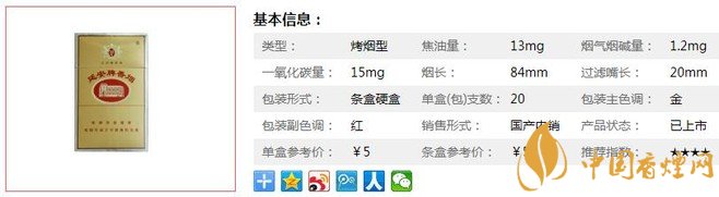 類(lèi)型 :烤煙型 焦油量 :13mg 煙氣煙堿量 :1.2mg 一氧化碳量 :15mg