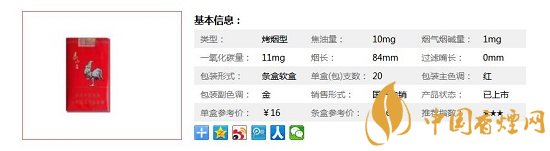 類型 :烤煙型 焦油量 :10mg 煙氣煙堿量 :1mg 一氧化碳量 :11mg