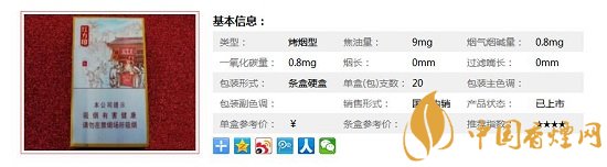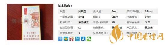 一盒20支,煙長(zhǎng)94mm,焦油量8mg,煙堿量0.8mg,一氧化碳量8mg
