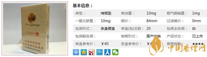 類型 :烤煙型 焦油量 :10mg 煙氣煙堿量 :1mg 一氧化碳量 :10mg
