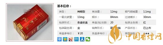 類型 :烤煙型 焦油量 :12mg 煙氣煙堿量 :1.1mg 一氧化碳量 :13mg