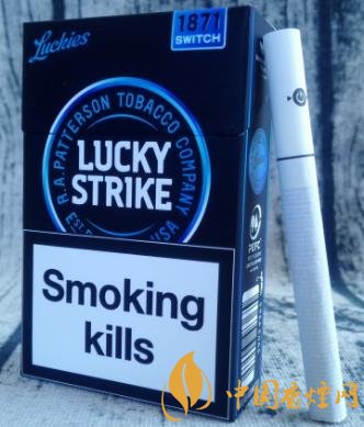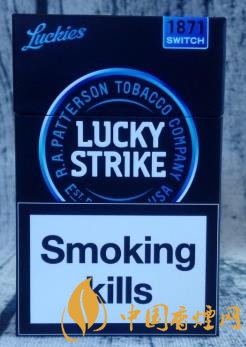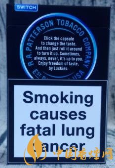 藍色,本就屬于神秘的色調(diào)。二者結(jié)合起來,帶來的視覺感,無疑更加強烈。撫摸煙盒的六面體,觀賞著黑藍相融的色調(diào),不失為一種雅趣。圓圈中的LUCKY  STRIKE,撫摸起來凹凸感很明顯。翻蓋處1871下方的SWITCH,意為“轉(zhuǎn)變、轉(zhuǎn)換”,也就是指因為過濾嘴內(nèi)置爆珠,從而改變煙的味道。這款歐盟版的煙盒正面上方,沒有印制CLICK(捏破)字樣及爆珠標識,煙盒底部和內(nèi)襯錫紙上則有印制。