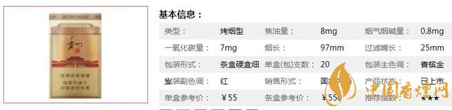 類型 :烤煙型 焦油量 :8mg 煙氣煙堿量 :0.8mg 一氧化碳量 :7mg