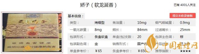 嬌子軟龍涎香煙支長(zhǎng)84mm,過(guò)濾嘴:25mm,嘴棒內(nèi)含龍涎香韻精華,品鑒時(shí),輕揉“龍珠”,煙草本香與龍涎香韻融匯和諧,去蕪存菁,雙重體驗(yàn),回味無(wú)窮。下面我們一起來(lái)看嬌子軟龍涎香的參數(shù)信息:焦油量:10mg 煙堿量:0.9mg 一氧化碳量:8mg