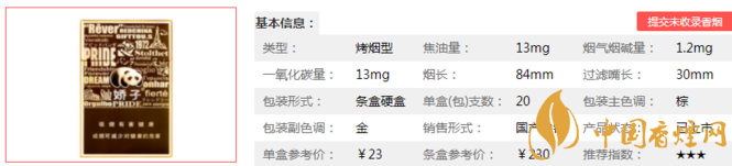 類型 :烤煙型 焦油量 :13mg 煙氣煙堿量 :1.2mg 一氧化碳量 :13mg