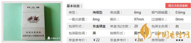 類(lèi)型 :烤煙型 焦油量 :6mg 煙氣煙堿量 :0.6mg 一氧化碳量 :6mg