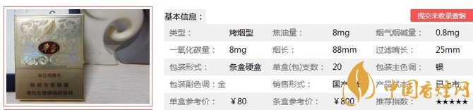 類型 :烤煙型 焦油量 :8mg 煙氣煙堿量 :0.8mg 一氧化碳量 :8mg