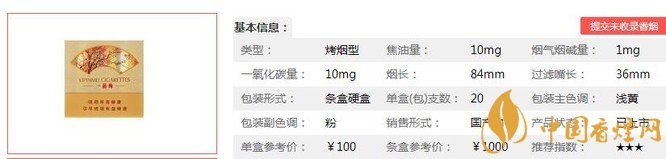 類型 :烤煙型 焦油量 :10mg 煙氣煙堿量 :1mg 一氧化碳量 :10mg