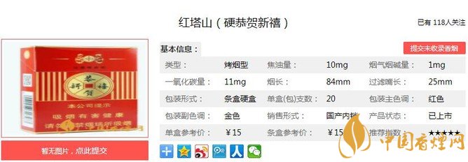 紅塔山硬恭賀新禧煙支長(zhǎng)84mm,過濾嘴長(zhǎng):25mm,紅塔山(硬恭賀新禧)”首創(chuàng)“香氣移植技術(shù)”,并加入獨(dú)創(chuàng)“滇橄欖”提取物,以一縷悠然清香,推動(dòng)煙草對(duì)其本味的充分演繹,自然甘香豐潤(rùn)飽滿回味綿長(zhǎng)。下面我們一起來看紅塔山硬恭賀新禧的參數(shù)信息:焦油量:10mg 煙堿量:1.0mg 一氧化碳量:11mg