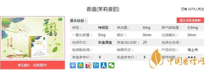 泰山茉莉香韻煙支長97mm,過濾嘴香煙,將煙葉和花茶中精萃的芳香物質(zhì)以涂層的方式入鋁箔紙,悠長醇化,每一根卷煙,一直到被您享用的那一刻,她的醇化歷程才算完成。下面我們一起來看泰山茉莉香韻的參數(shù)信息:焦油量:6mg 煙堿量:0.6mg 一氧化碳量:5mg