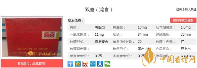 其所選用的煙葉全部來自于海拔1200米以上的山地生態(tài)煙葉,保證了原料上的優(yōu)越性,配以廣東中煙自主研發(fā)的三元復(fù)合濾嘴,起到了增香、保潤、提純的作用,使鴻喜產(chǎn)品的煙氣柔和綿長,口感圓潤生津,香氣飽滿透發(fā),真正做到了剛?cè)岵?jì)。經(jīng)香煙網(wǎng)小編市場調(diào)查雙喜鴻喜售價(jià)為25元/包。