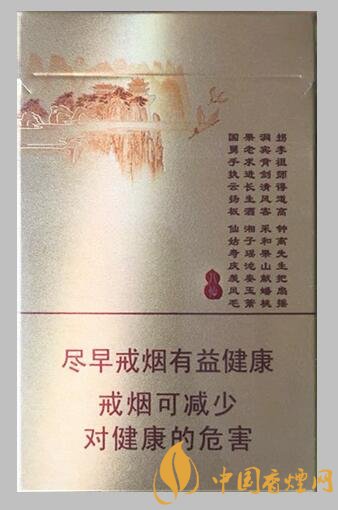 煙盒正面翻蓋處的八仙過(guò)海四字的設(shè)計(jì),有些與金圣的滕王閣相似。主圖為騰云駕霧的老哥八個(gè),應(yīng)該屬于線條畫(huà)的類(lèi)型。警示語(yǔ)句為最新版本。整體為三段,最上段為燙金畫(huà)面,顏色與最下面部位相同。煙盒背面采用七言律詩(shī)的格式,簡(jiǎn)介了八仙各自的特點(diǎn)。整體包裝十分有神韻。