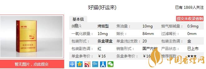 應(yīng)用新型保潤技術(shù)有效降低了煙氣的干燥感和刺激性,煙氣醇和溫潤,余味干凈舒適,口感甜潤柔和,給消費(fèi)者帶來“天然、輕松、舒適”的吸食體驗。經(jīng)香煙網(wǎng)小編市場調(diào)查好貓好運(yùn)來售價為16元/包。